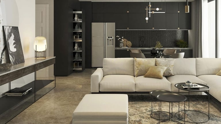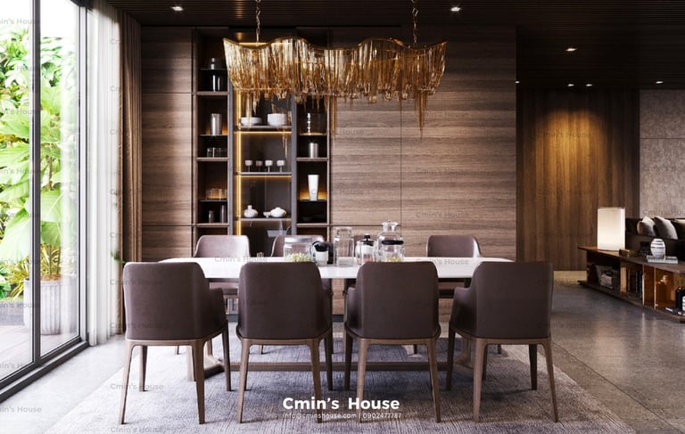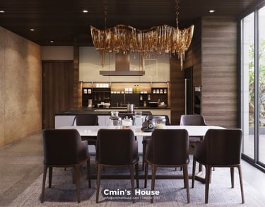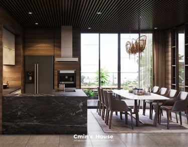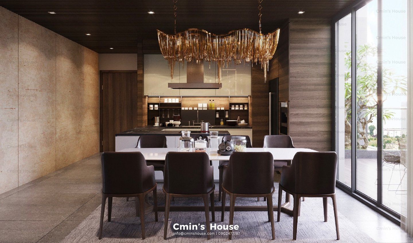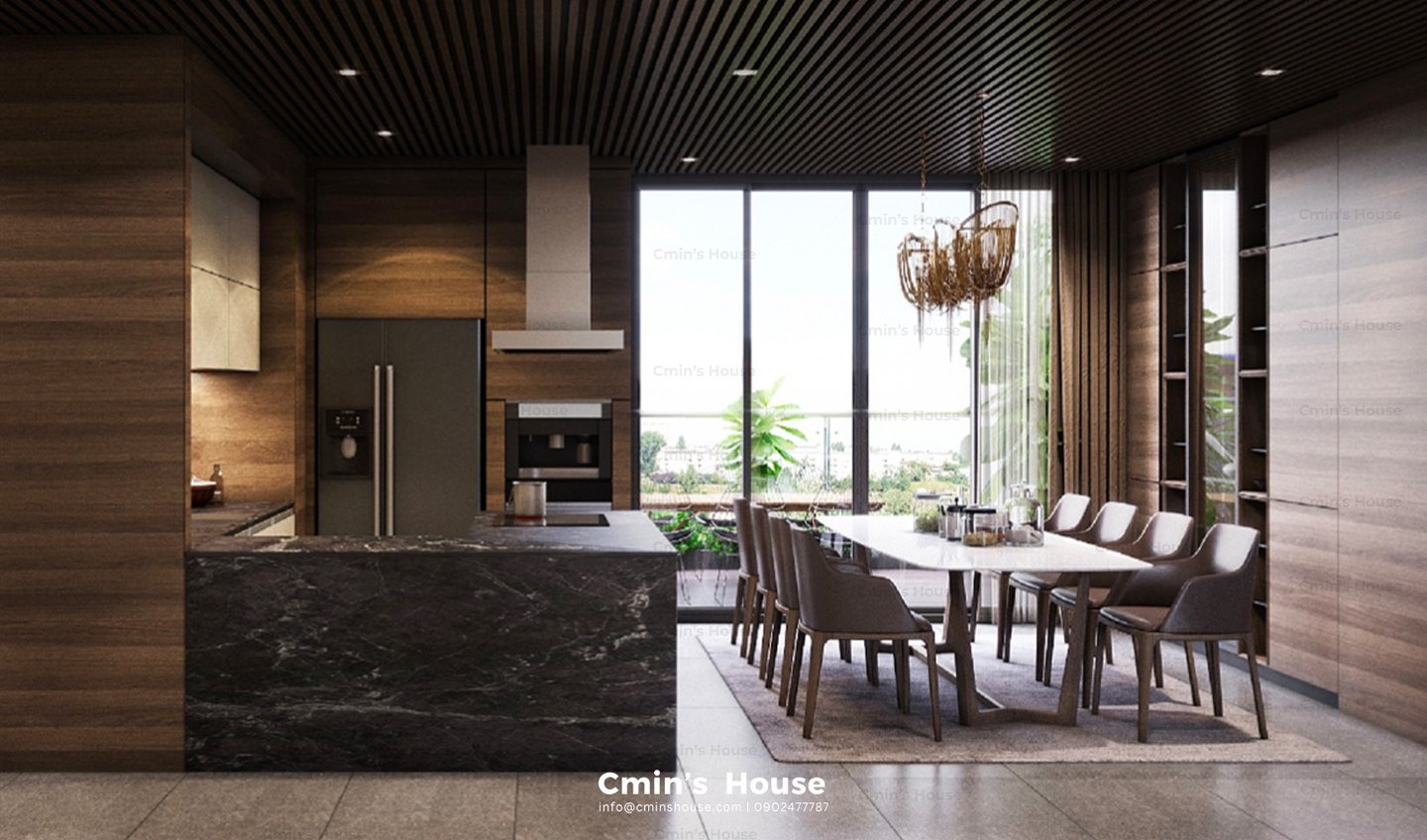 Vẫn giữ nguyên ngôn ngữ thiết kế cao cấp như các không gian khác, phòng khách - bếp được thiết kế ấm cúng với độ hoàn thiện sắc nét nhưng vẫn để lại dấu ấn riêng. Gỗ và đá bổ sung cho nhau về độ sáng bóng và kết cấu. Những thứ này có thể được ốp xen kẽ với các bức tường kính để mang đến một tầm nhìn triệu đô.