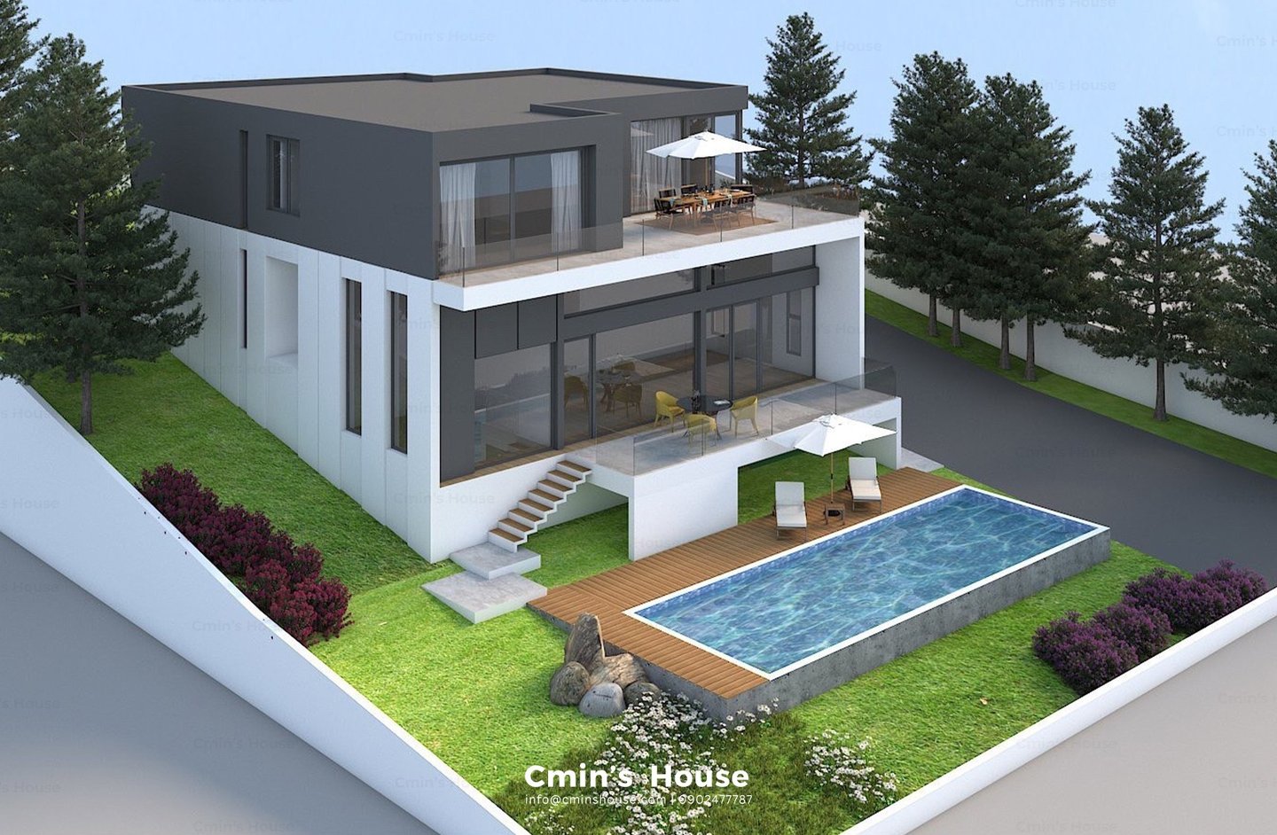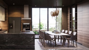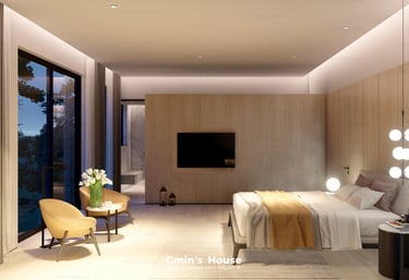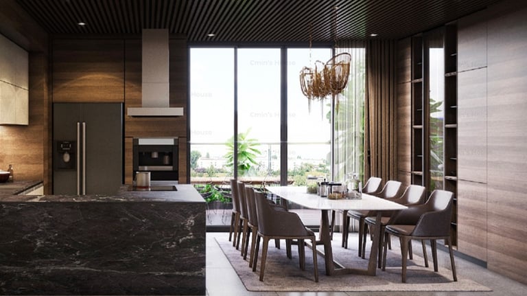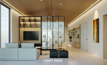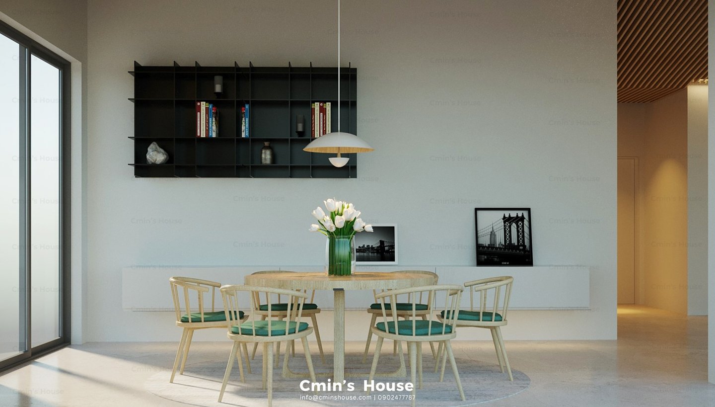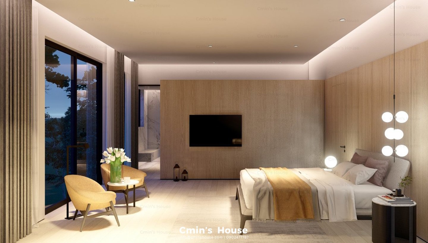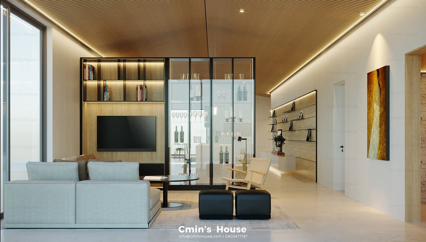 Vẫn giữ nguyên những nét đặc trưng cơ bản của kiến trúc hiện đại như hình khối vuông vức, bảng màu trung tính và lối thiết kế tinh giản. Dự án đem đến sự ấn tượng bởi nét độc đáo riêng khi khéo léo bổ sung hệ trần gỗ mềm mại mang đến sự cân bằng và nhấn điểm cho thiết kế.