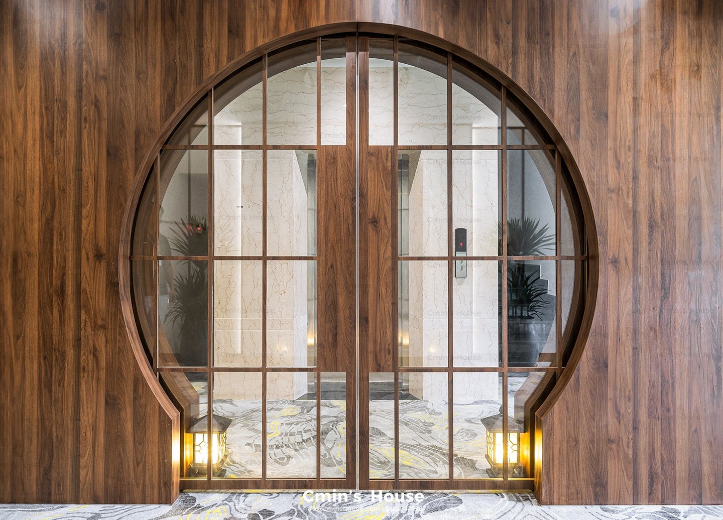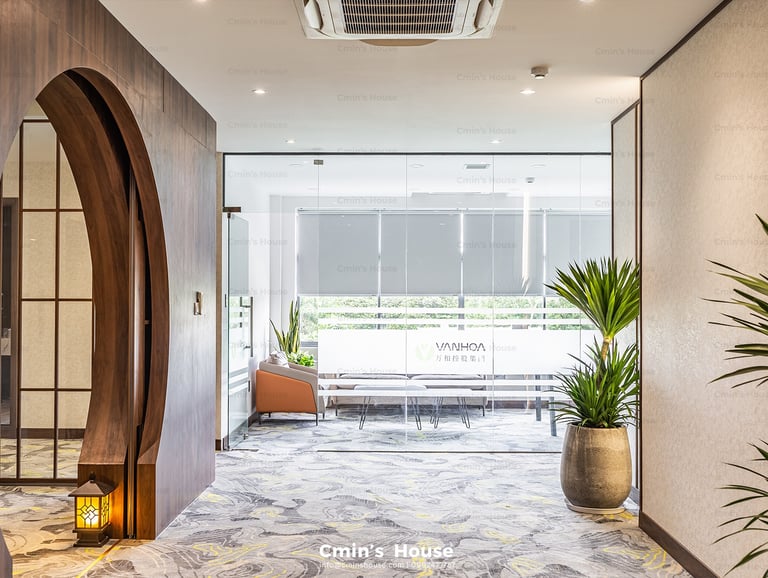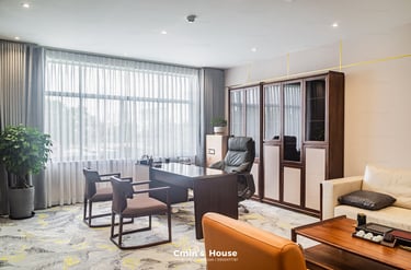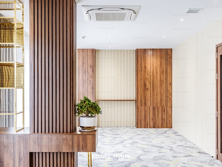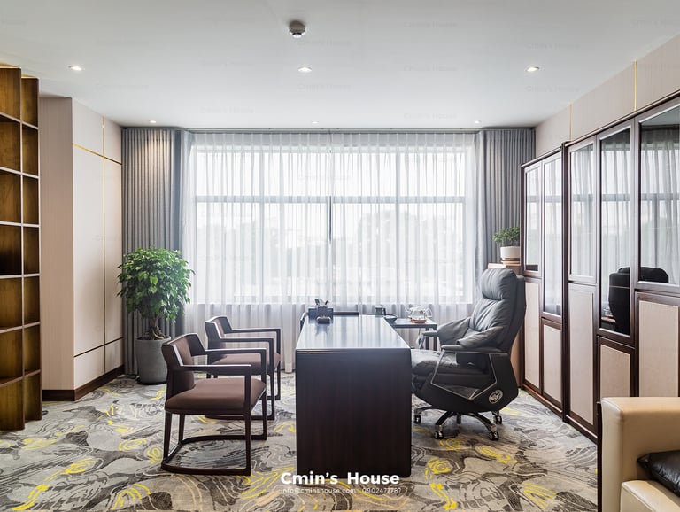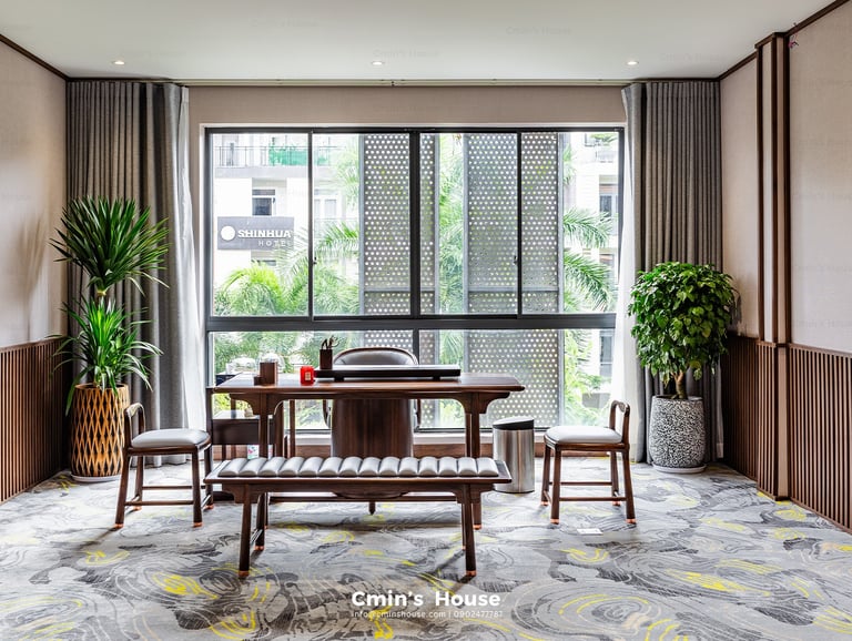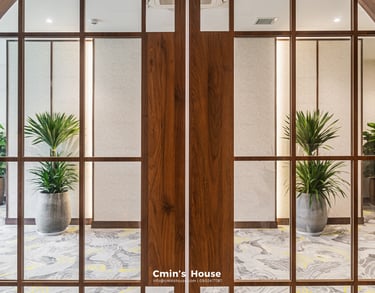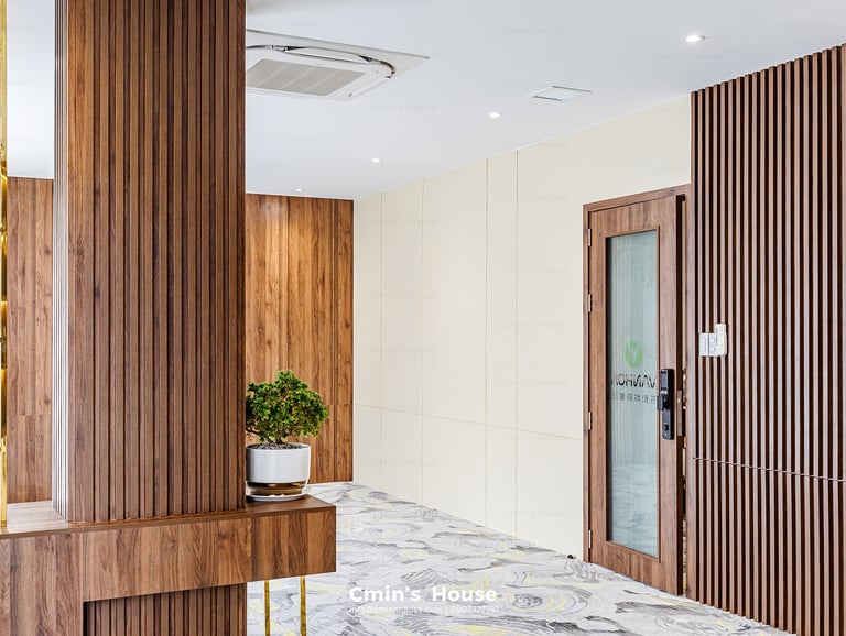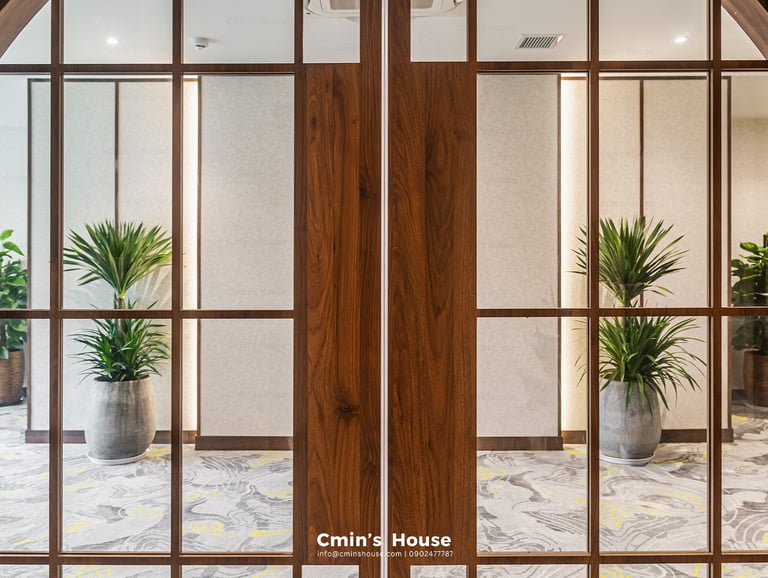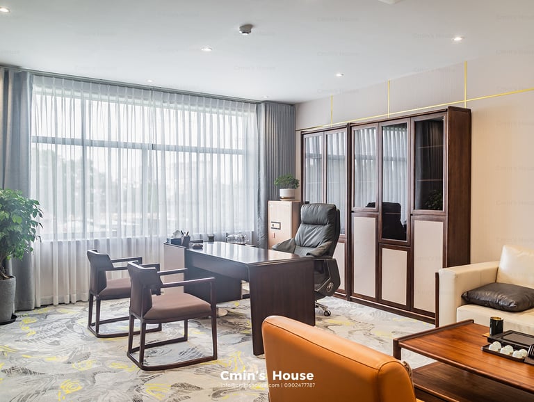 Hình ảnh thực tế văn phòng làm việc dành cho cổ đông cấp cao, thể hiện phong cách sang trọng và uy nghi. Nội thất gỗ tự nhiên với gam màu nâu trầm không chỉ tối ưu về công năng mà còn tạo nên vẻ đẹp thẩm mỹ đầy ấn tượng. Điểm nhấn đặc biệt của thiết kế là cửa sảnh hoành tráng, kết hợp giữa lam sóng và vách kính, được nhấn mạnh bằng khung gỗ caro đầy huyền bí.