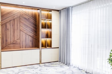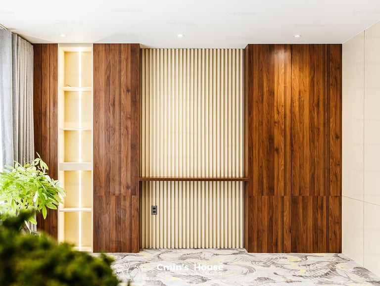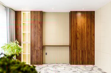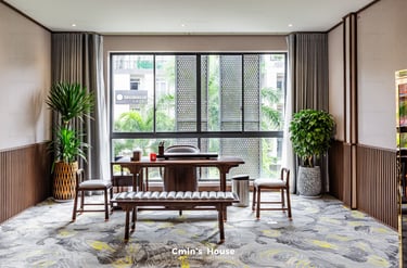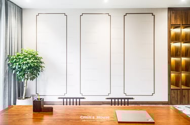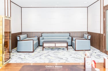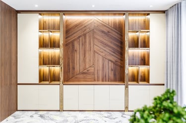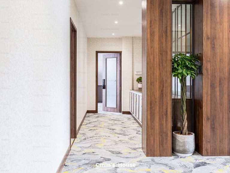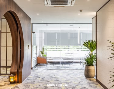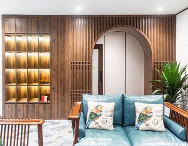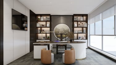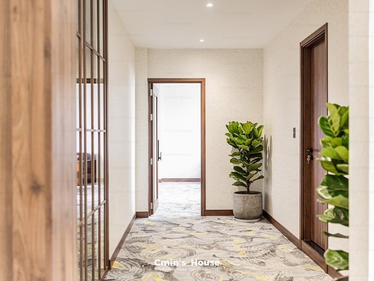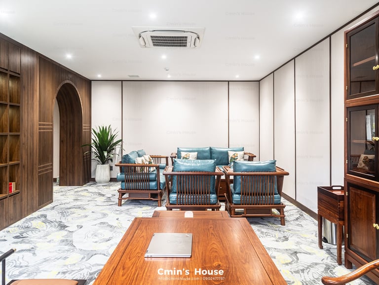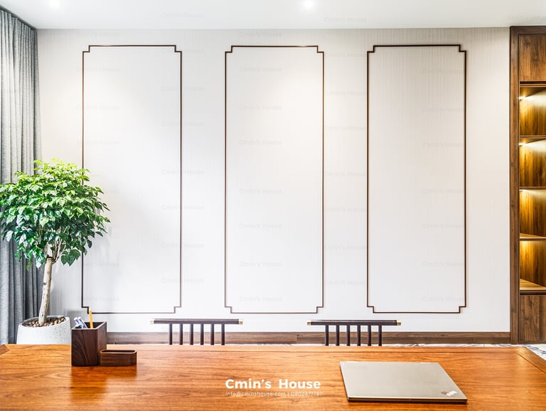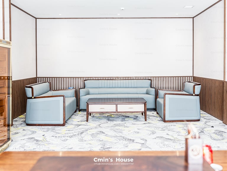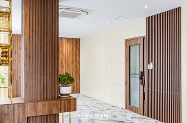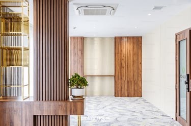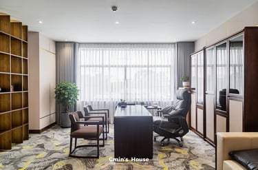 Hình ảnh thực tế văn phòng làm việc dành cho cổ đông cấp cao, thể hiện phong cách sang trọng và uy nghi. Nội thất gỗ tự nhiên với gam màu nâu trầm không chỉ tối ưu về công năng mà còn tạo nên vẻ đẹp thẩm mỹ đầy ấn tượng. Điểm nhấn đặc biệt của thiết kế là cửa sảnh hoành tráng, kết hợp giữa lam sóng và vách kính, được nhấn mạnh bằng khung gỗ caro đầy huyền bí.