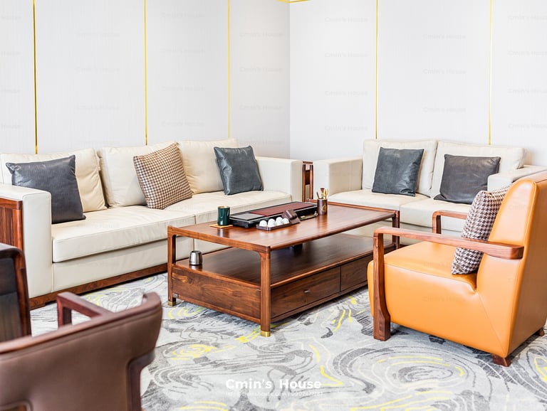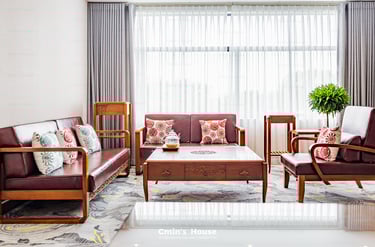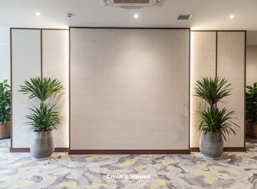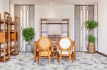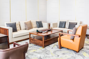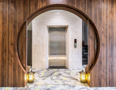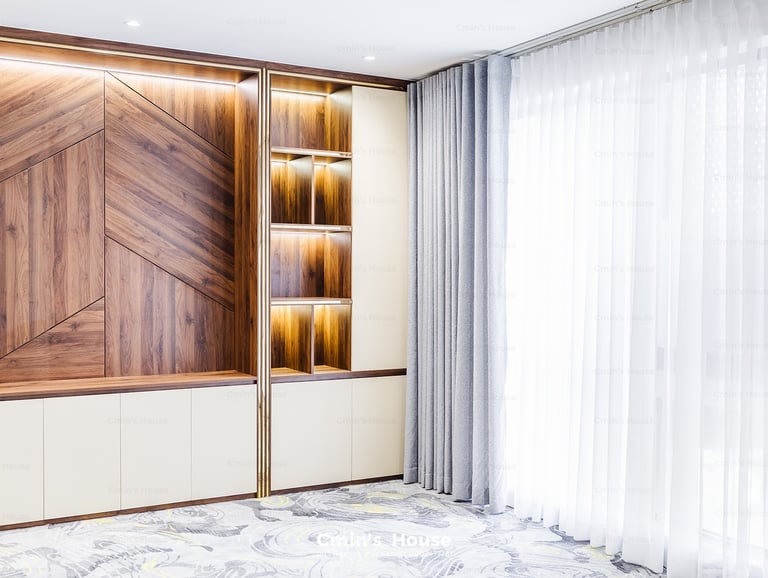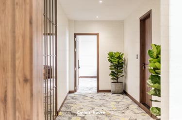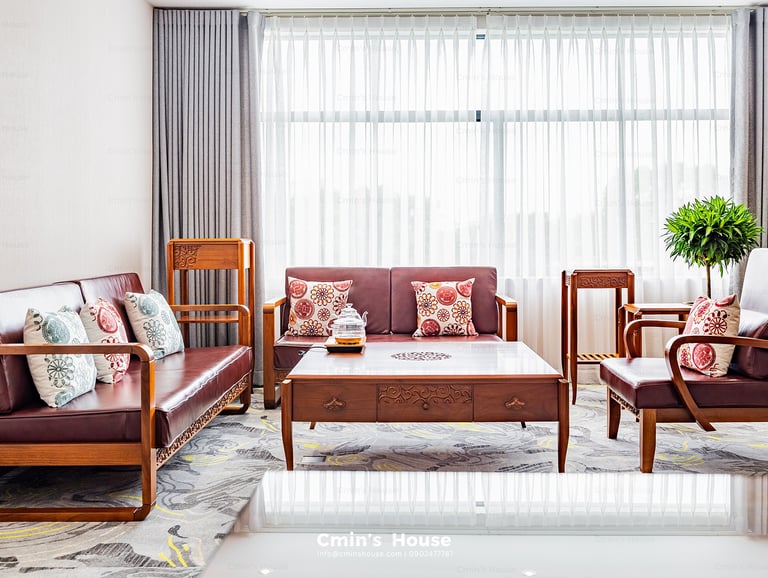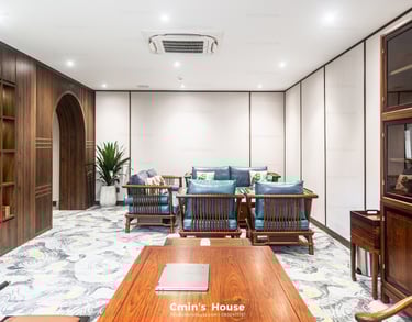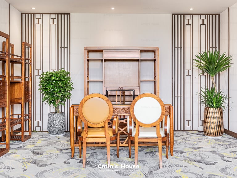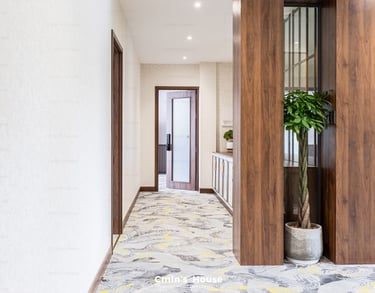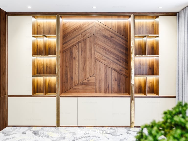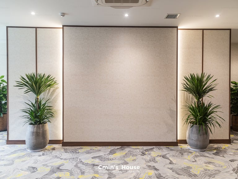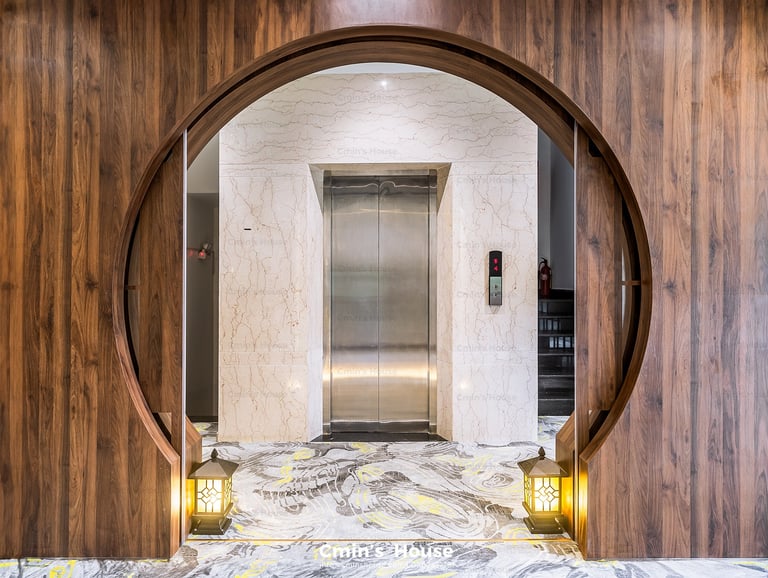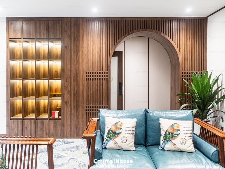 Hình ảnh thực tế văn phòng làm việc dành cho cổ đông cấp cao, thể hiện phong cách sang trọng và uy nghi. Nội thất gỗ tự nhiên với gam màu nâu trầm không chỉ tối ưu về công năng mà còn tạo nên vẻ đẹp thẩm mỹ đầy ấn tượng. Điểm nhấn đặc biệt của thiết kế là cửa sảnh hoành tráng, kết hợp giữa lam sóng và vách kính, được nhấn mạnh bằng khung gỗ caro đầy huyền bí.