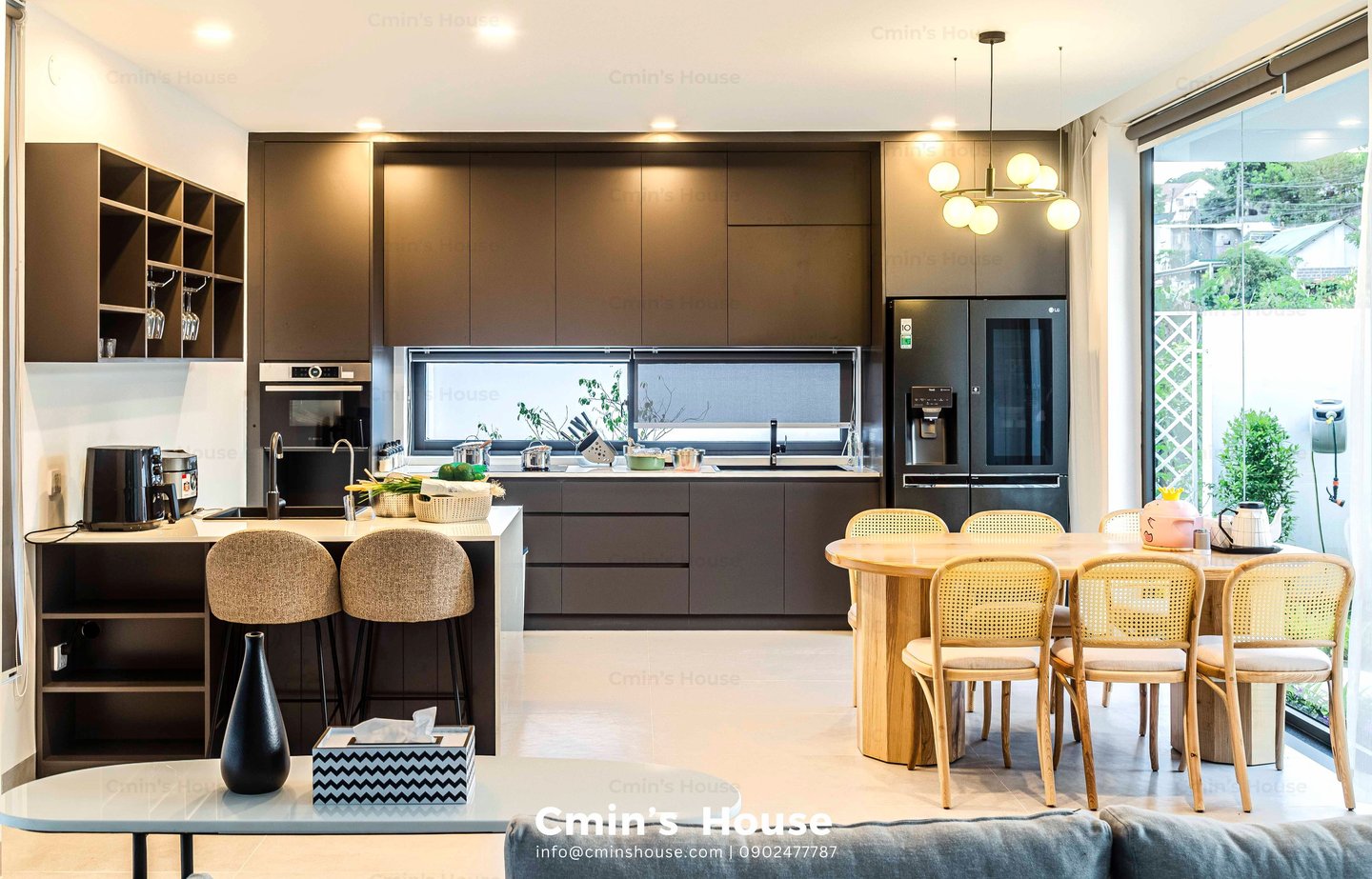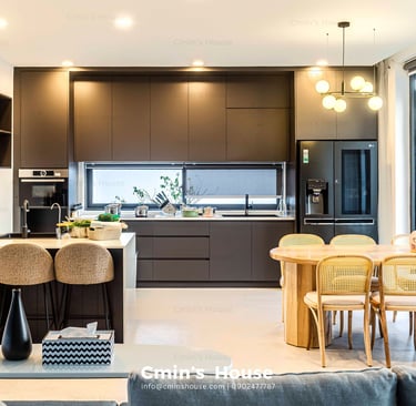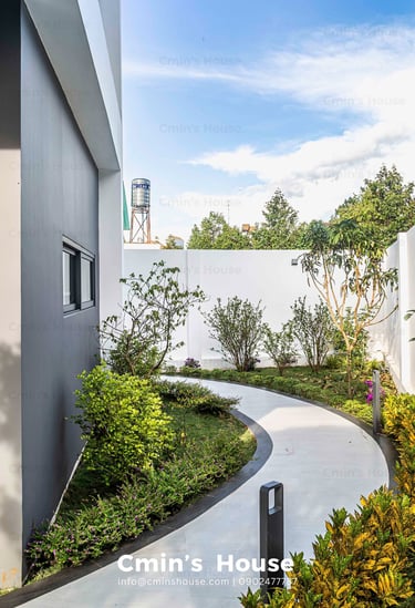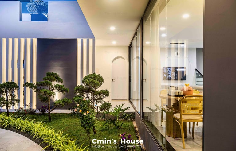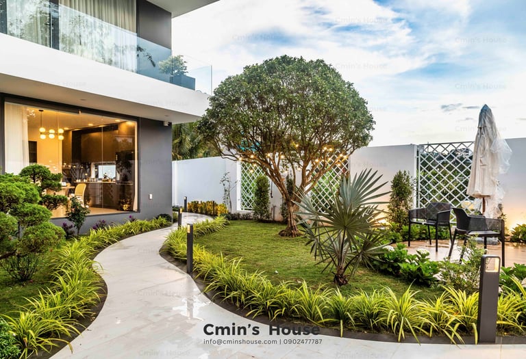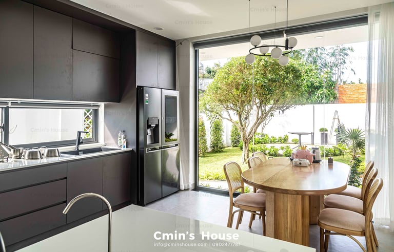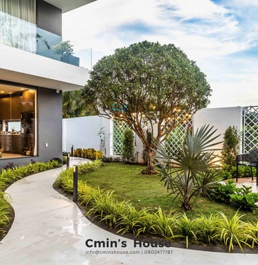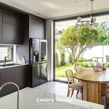 Biệt thự sân vườn hiện đại được thiết kế với bố cục mở, xen kẽ giữa không gian sống và thiên nhiên kiểu phương Tây. Điển hình là khu vực sinh hoạt chung gồm phòng khách, bếp, ăn được bố trí liền mạch, hướng tầm nhìn ra khu vườn với những mảng xanh nhẹ nhàng. Khung cửa kính lớn với kỹ thuật thi công khéo léo giúp gia chủ dễ dàng sử dụng mỗi khi đóng - mở.